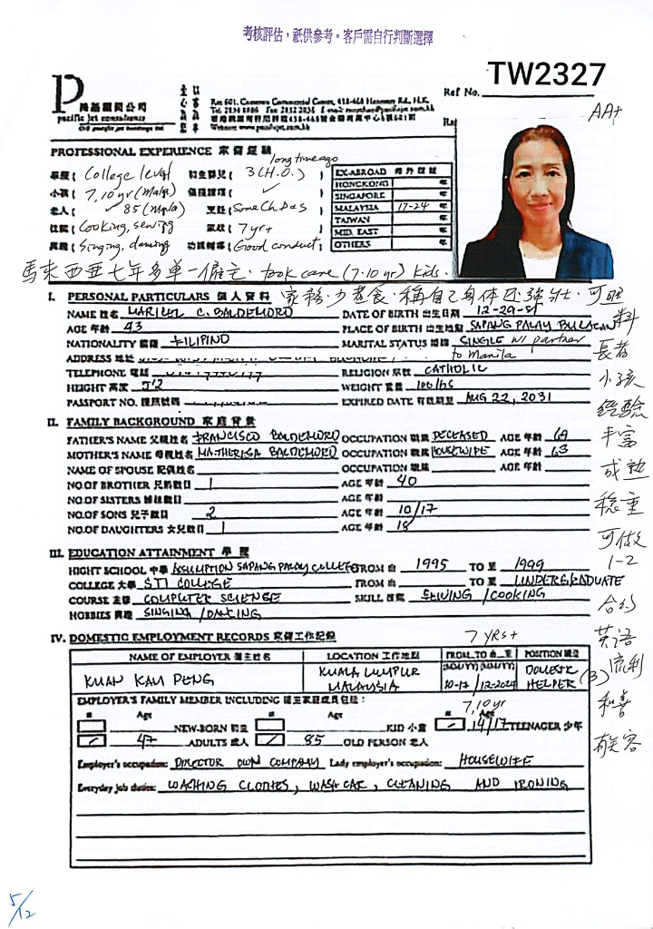 | 已婚兩孩之母,菲六年家傭湊多名小孩。高中程度,英語清晰流利,來自南部,勤奮有笑容,應對佳﹔合照顧初生及小童。 |